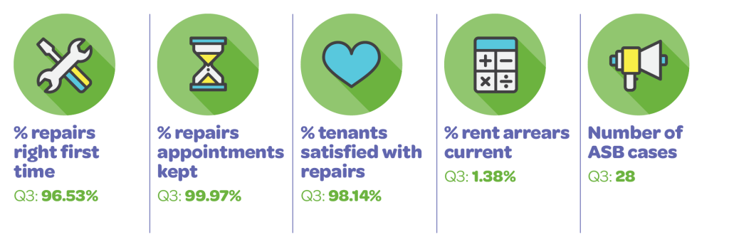 In 2025/26 we asked our tenants to choose the top 5 KPI’s that mean the most to them, so they can see how we stack up! We will post the latest quarter stats when they are available.