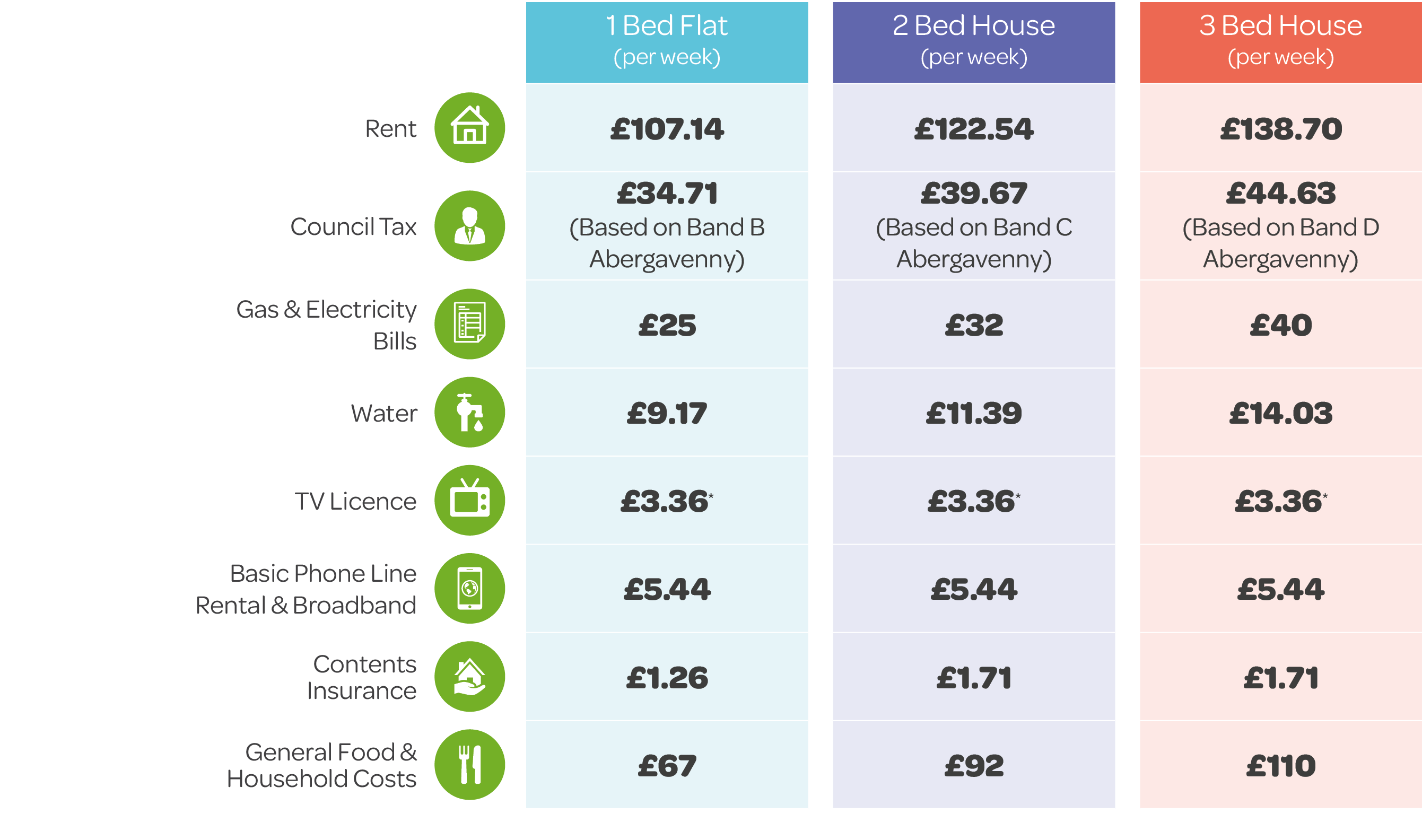 To help you get an idea of what you might expect to pay for running your home, we’ve pulled together this table of estimated costs. Costs are based on a property in Abergavenny in 2023, using publicly available information. The actual cost of running your home will vary, depending on your individual circumstances and household choices.