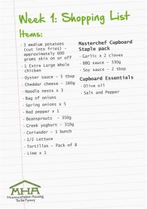 Here’s your shopping list for week 1, it’s designed so you can repurpose ingredients to ensure you can make a variety of dishes.