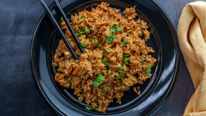 - Scrambled eggs: while the rice is cooking, heat the oil in a large frying pan and put it over a medium heat pour in the eggs and scramble until just set, then tip onto a plate and set aside.
