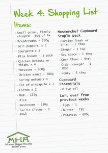 Here’s your shopping list for week 4, it’s designed so you can repurpose ingredients to ensure you can make a variety of dishes. Don’t forget to check out your local community fridges as you may be able to source some ingredients from them.