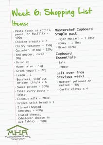 Here’s your shopping list for week 6, it’s designed so you can repurpose ingredients to ensure you can make a variety of dishes. Don’t forget to check out your local community fridges as you may be able to source some ingredients from them.